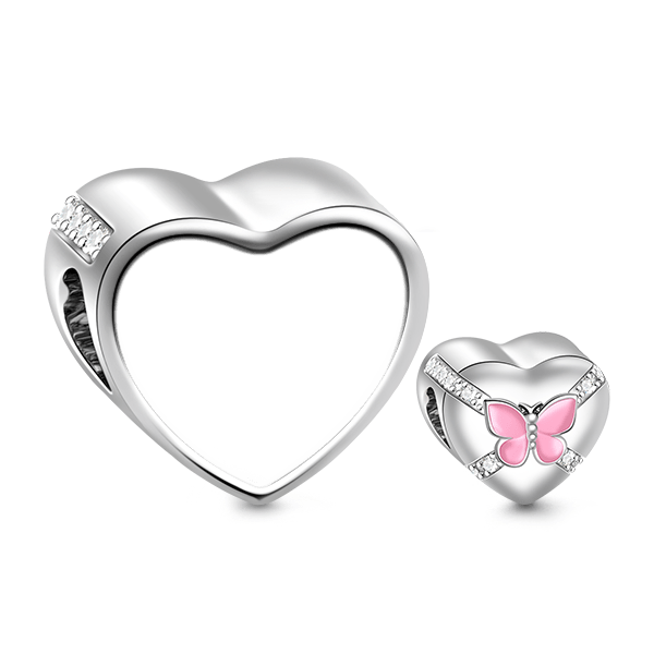 Gnoce "Forever Love" Heart Shaped Pink Butterfly Photo Bead Charm